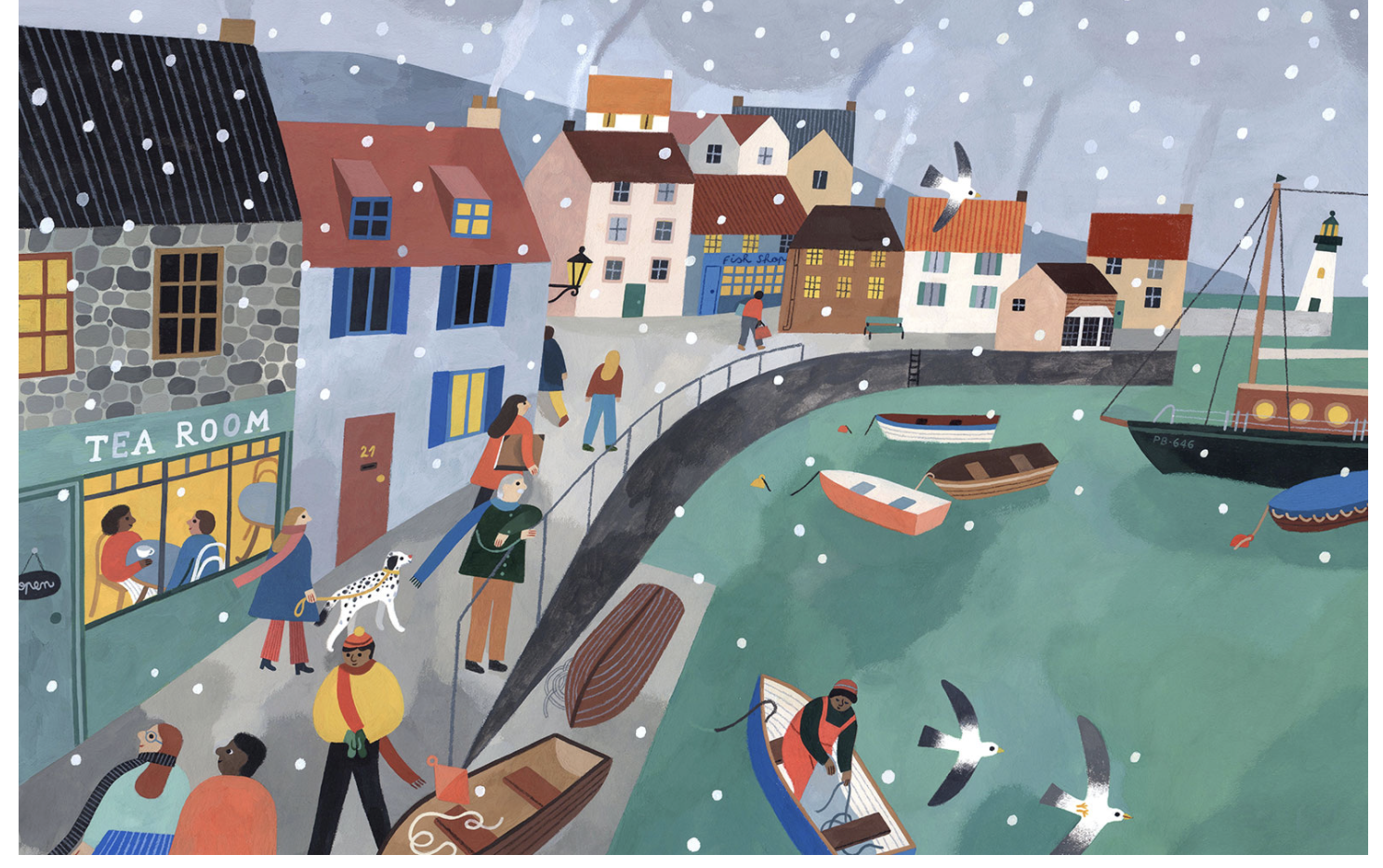 The process was a little challenging because the editor wanted: a night scene with some snow, and some lights on a bookstore window.