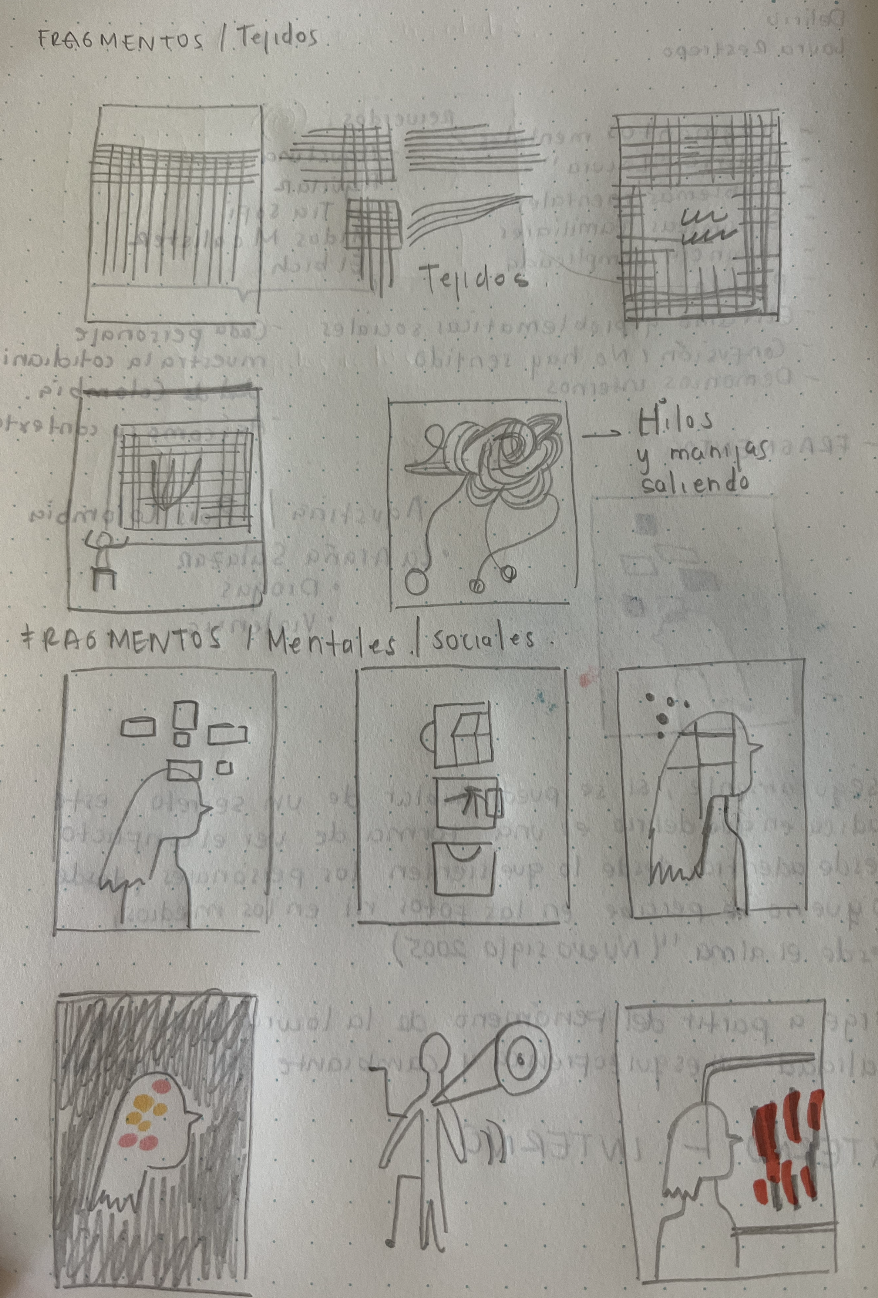 En este ejercicio quise ir más allá: no solo exploré el estado mental de Agustina, la protagonista, sino tambien el contexto social y político de la Colombia de los años 90. A partir de esto, trabajé con el concepto de fragmentación para reflejar tanto la mente fracturada del personaje como la sociedad igualmente quebrada.